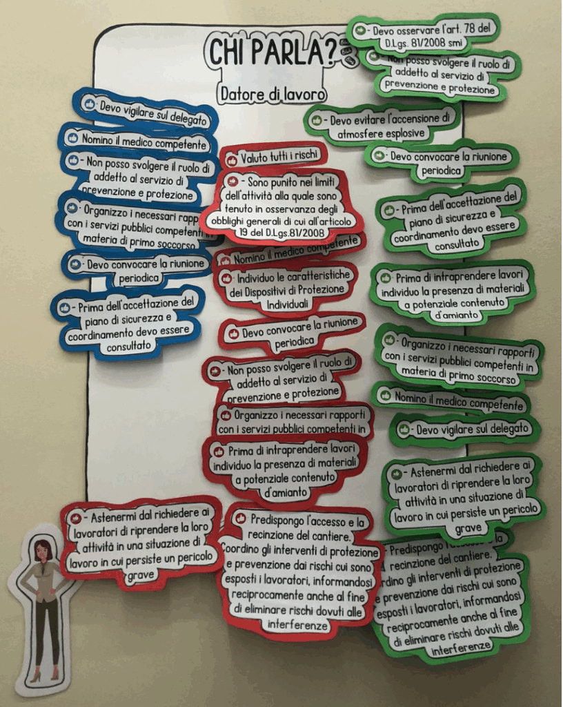 Le squadre ricevono frasi e fumetti da collocare su grandi cartelloni che rappresentano i diversi ruoli aziendali. Attraverso il confronto e la riflessione, i partecipanti imparano a riconoscere punti di vista, responsabilità e linguaggi diversi all’interno dell’organizzazione.
